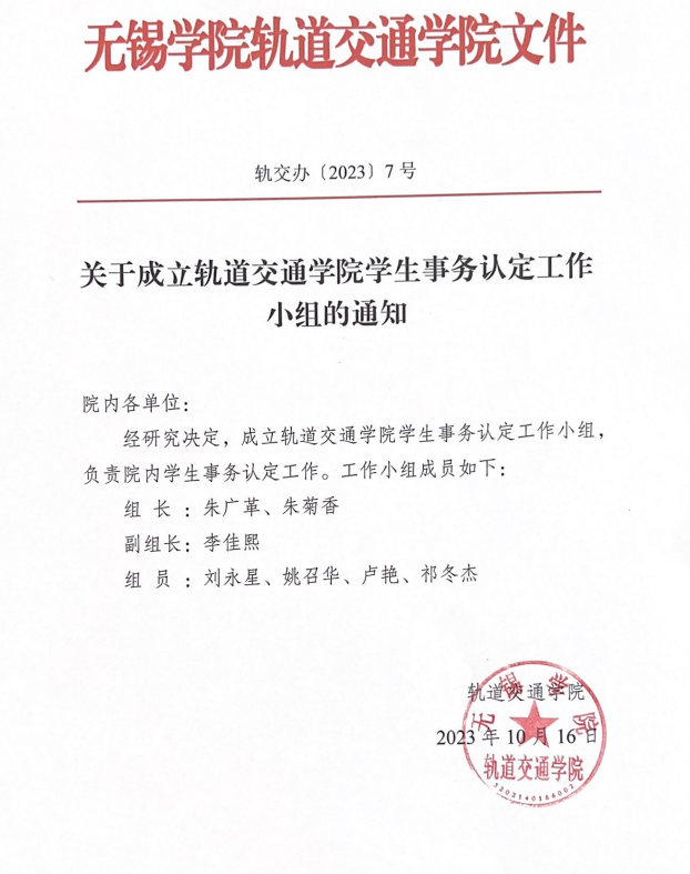关于成立轨道交通学院学生事务认定工作小组的通知
