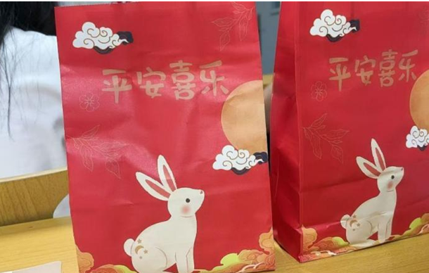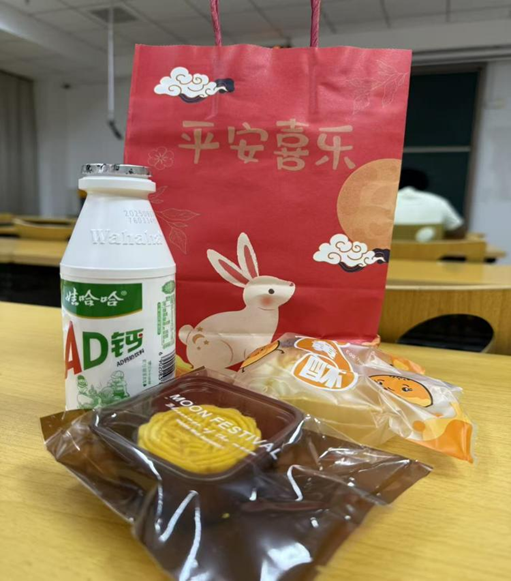 中秋晚会开始,一份份由学院精心准备的中秋礼品袋被送到每一位同学手中。打开它,里面是满盈的惊喜:象征团圆的可口月饼,寓意圆满的蛋黄酥,以及一瓶充满童年回忆的娃哈哈AD钙奶。在美食的品鉴过程中,同学的关系迅速升温,整个班级洋溢在欢快的氛围里。
